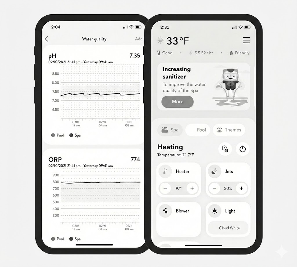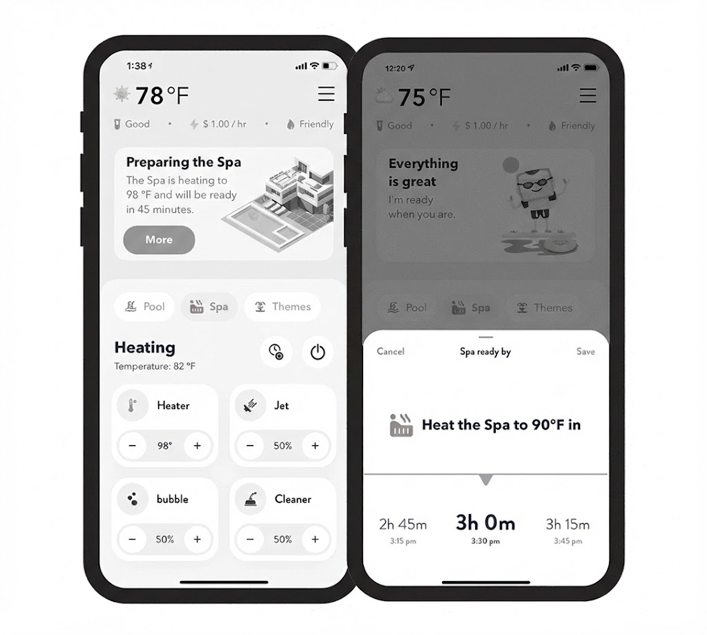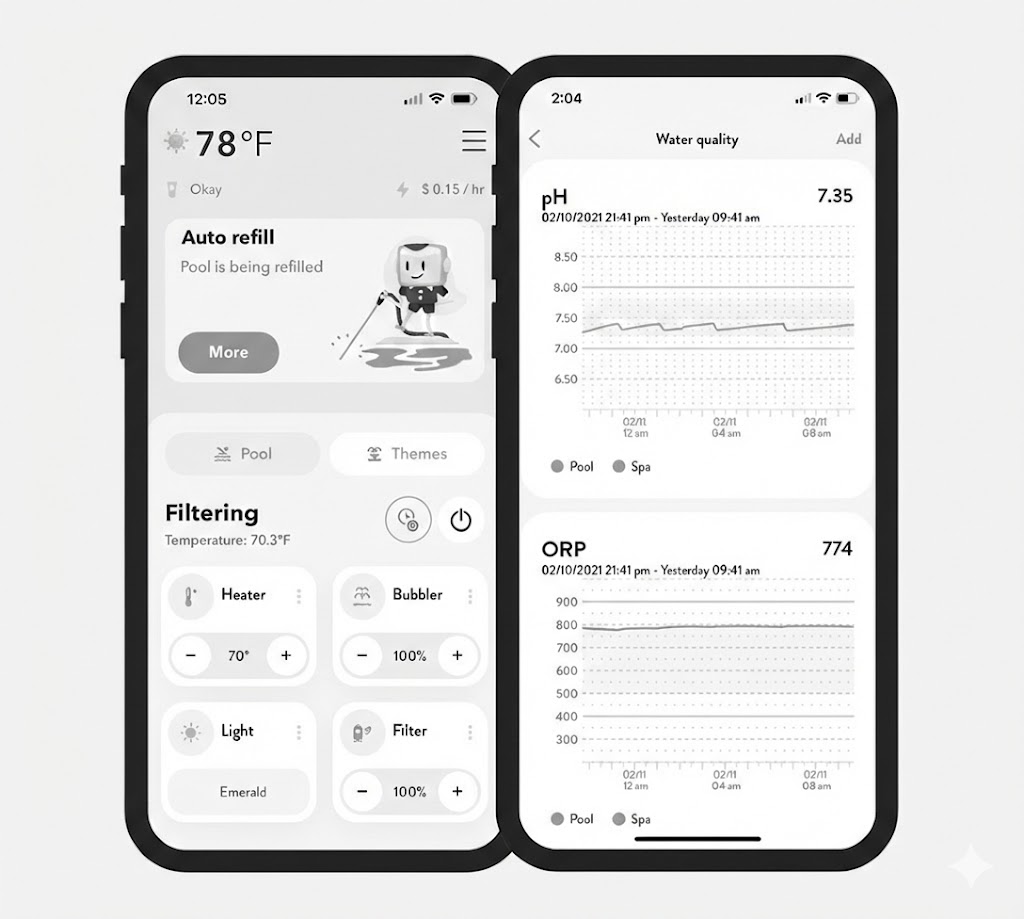 Smart control of pumps, lights, temperature, and scheduling.